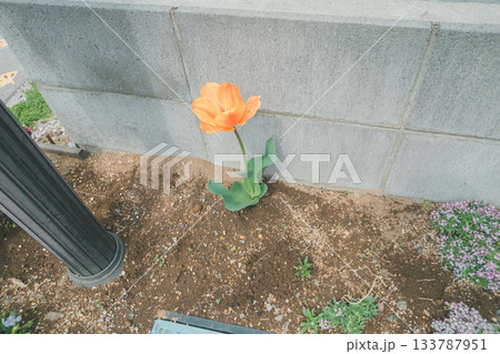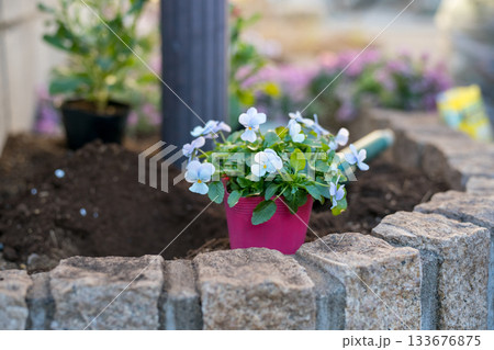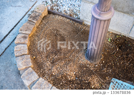 ポスト下の小さな花壇に花苗を植える