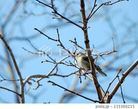 北海道の遅い春の景色 青空と桜の枝に止まる鶯