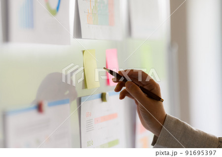 会議室で透明ボードにカラー付箋紙を貼る女性