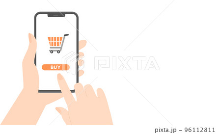 ショッピングカートとBUYの文字が表示されているスマホを持つ人の手 - 買い物・ネットショッピング