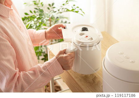 キッチンラックに新しい電気ケトルを置くミドル女性