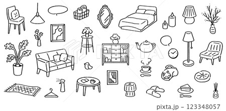 手書きのかわいいホームインテリアイラストのセット。ベクターデータで色替え変更可能。