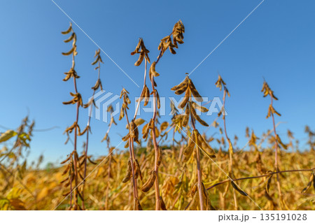 Soybeans vibrant imagery, Highresolution capture of mature soybeans against bright sky, Photograph showcasing soybean pods with emphasis on texture and seed development