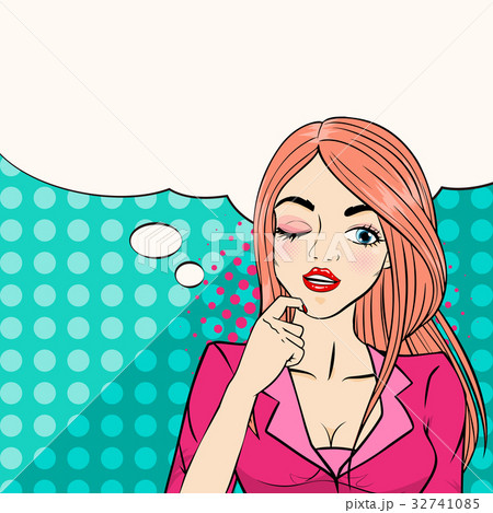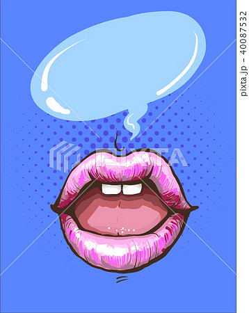Woman pink lips with gum bubble speech on pop art background. Vector illustration