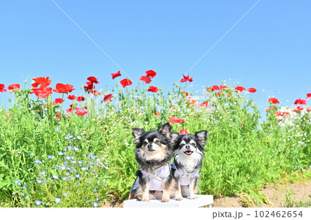 笑顔の仲良しチワワと満開のポピー畑 埼玉県鴻巣市 ポピーハッピースクエア 春