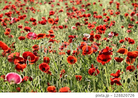 朝露付く野草の中に咲くポピーの花とポピーの花畑