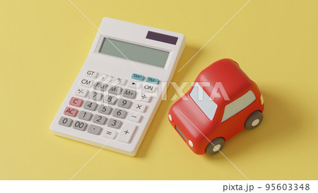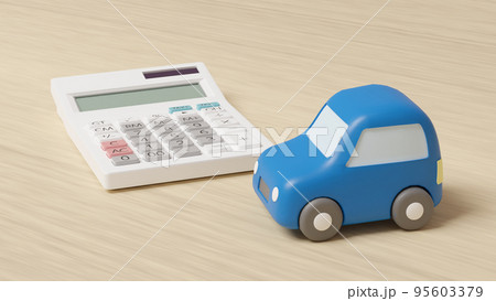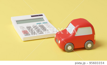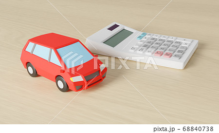 平面上に置かれた自動車のおもちゃと電卓のCGによるフォトリアルなイラスト