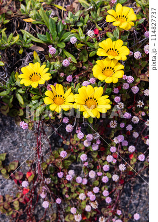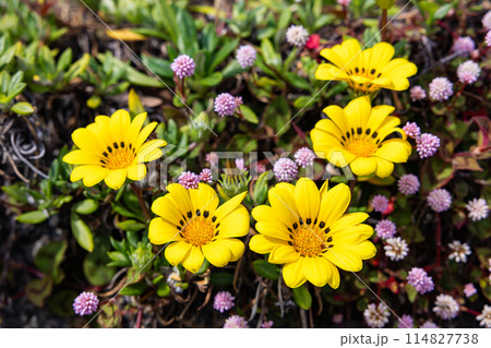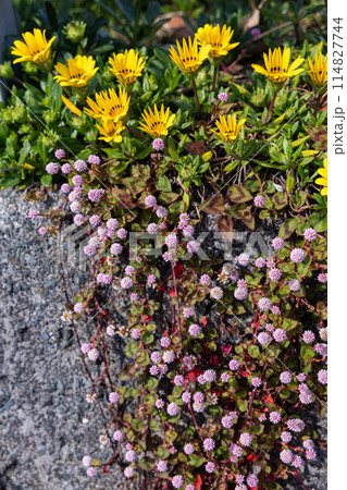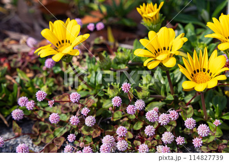 ガーデンで鮮やかに咲く美しいガザニアとヒメツルソバの花