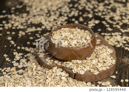 Rolled oats in wooden bowl, closeup view. Concept of clean eating, dieting. High quality photo