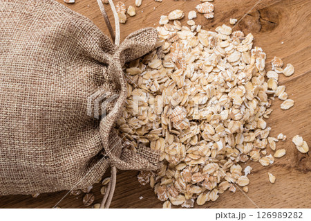 Oat flakes in a wooden bowl on sackcloth with copy space for your text. Top view