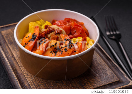 Boiled tiger shrimps with porridge, tomatoes and corn
