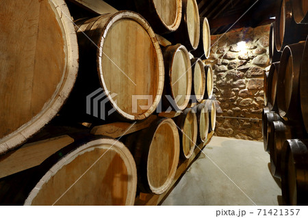 Wine barrels in a wine cellar. Oak Wine Barrels in winemaking and Winery Barrel room.