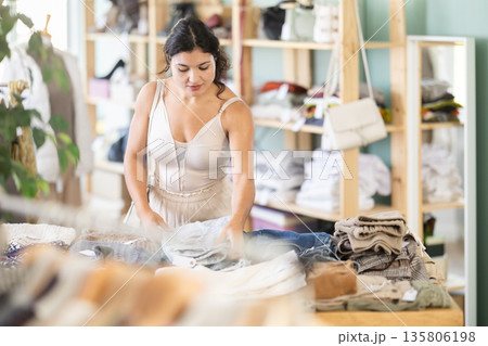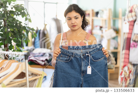 Latina chooses jeans in a clothing store