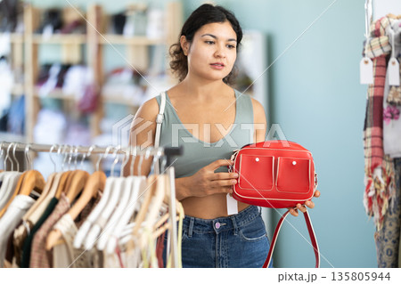 Latina woman choosing a stylish handbag in store with interest