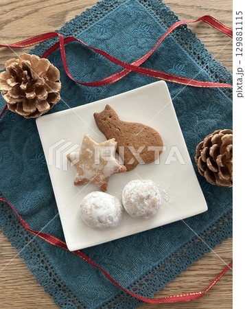 星と猫の型のシナモンクッキーとスノーボールのプレート