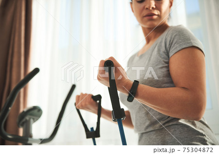 Closeup of woman exercising with fitness resistance tourniquet