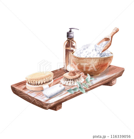Wooden tray, dispenser,brush,pumice stone,plate with salt, spatulain watercolor illustration on a white background. Hand drawn illustration of a set for advertising spas, baths, saunas, beauty salons