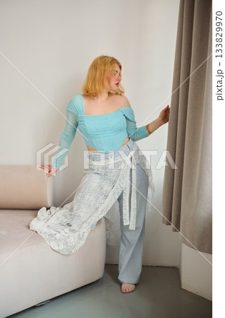 fashionable woman by window, professional photography capturing stylish woman in modern lounge setting