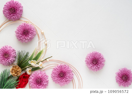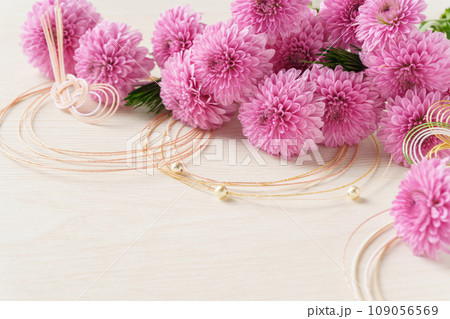 ポンポンマムと水引の和モダンな背景