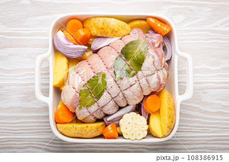 Raw wrapped rolled sliced pork in white casserole dish with potatoes, vegetables and herbs on rustic white wooden background top view. Pork roll with vegetables ready to be prepared