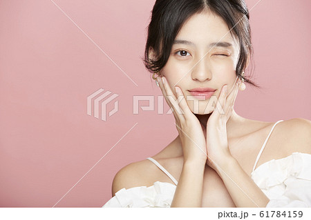 ピンク色背景の女性ビューティー写真