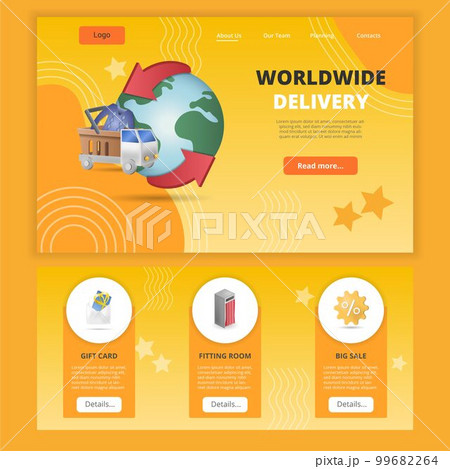 Worldwide delivery flat landing page website template. Gift card, fitting room, big sale. Web banner with header, content and footer. Vector illustration.