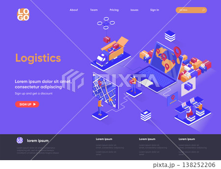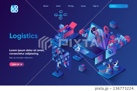 Logistics isometric landing page. Express delivery service, global freight shipping, warehousing and distribution isometry web page. Website flat template, vector illustration with people characters.