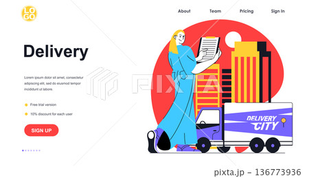 Delivery service web banner concept. Woman manages postage logistics, truck carries parcels, global shipping transportation landing page template. Vector illustration with people scene in flat design