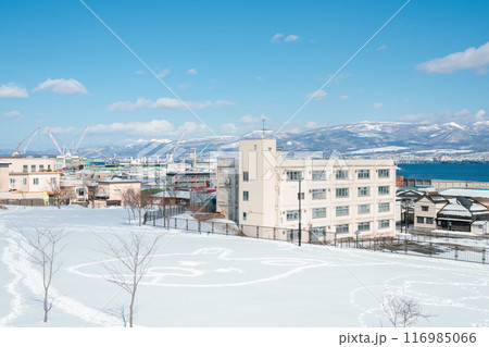 Motomachi Park Perry's Square and harbor city view at winter in Hakodate, Hokkaido, Japan