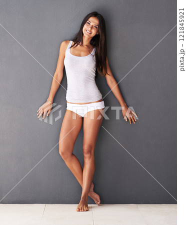 Healthy, fit and beautiful young woman posing in underwear against a grey background in studio. Attractive, stunning and seductive female feeling carefree and standing in a tank top and panties