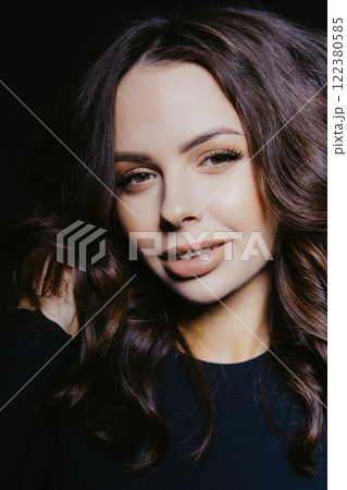 Fashionable woman face. Model with long brown hair and make-up on grey background.