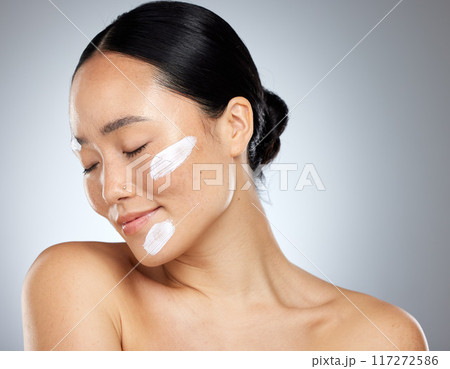 Skincare, face cream and dermatology with woman posing for health, wellness and natural beauty against mockup studio background. Cosmetics, asian girl and facial for self love and makeup routine
