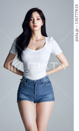アジア系の20代女性、シンプルなオーバーサイズの白いクルーネックTシャツ