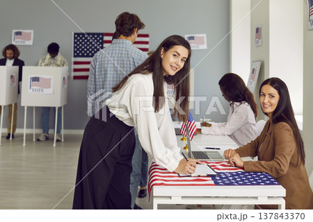 American citizens standing at vote center in voting booth at polling station on election day.