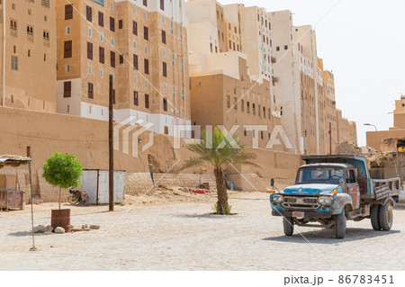 【イエメン】ハドラマウト、世界遺産シバーム・ハドラマウト遺跡の側に停車する古びたピックアップトラック