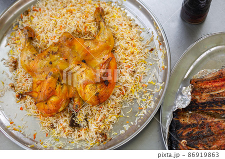 【イエメン】ハドラマウト、イエメ料理「マンディ」:香辛料で炊いたごはんに乗せられた炭火焼きチキン