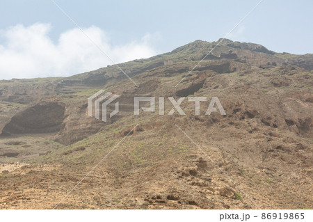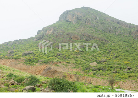 【イエメン】マハラ、麓から見上げた雑草で緑がかった岩山と空