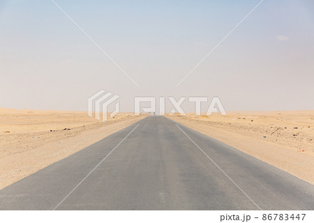 【イエメン】ハドラマウト、広大な砂漠の中に真っすぐ伸びるアスファルトの道路とその先に見える地平線