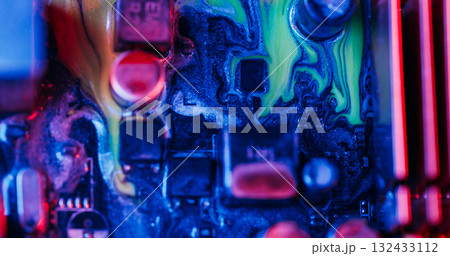 Ink flow. Digital hardware. Defocused blue red pink colorful glitter water electronic motherboard microchip on abstract art neon background.
