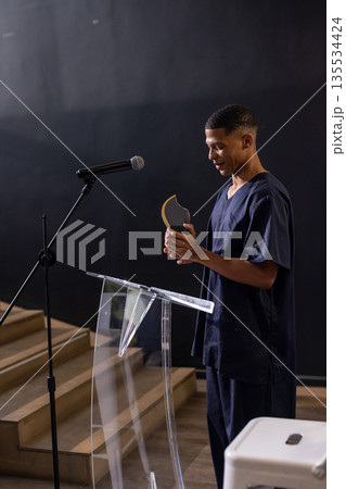 African American man speaking at lectern in lecture hall, with microphone and papers, copy space