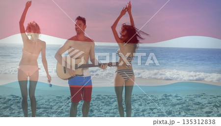 Friends in bikinis and trunks strumming acoustic guitar singing into mic dancing on beach at sunset