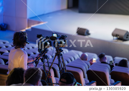Professional video crew filming live event on stage. Expertise in movie production television streaming using multimedia equipment. Industry creativity in cinematography, Video equipment, media and TV