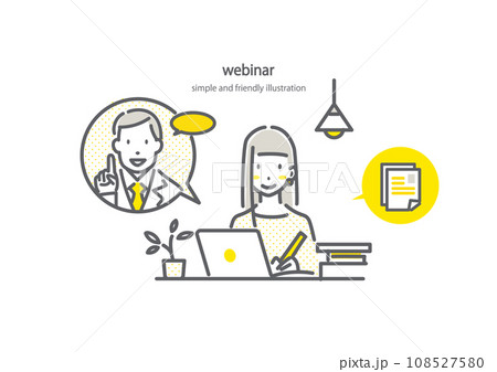 自宅でウェビナーに参加する若い女性 シンプルでお洒落な線画イラスト