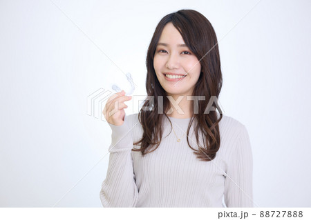 ホームホワイトニング イメージ 薬剤とマウスピースを持った若い女性