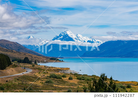 Landscape with curving alpine road, turquoise lake and snowy mountains, Mt Cook, New Zealand