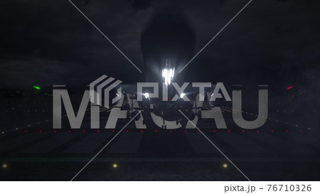 Commercial plane taking off from the airport runway and MACAU text, 3d rendering