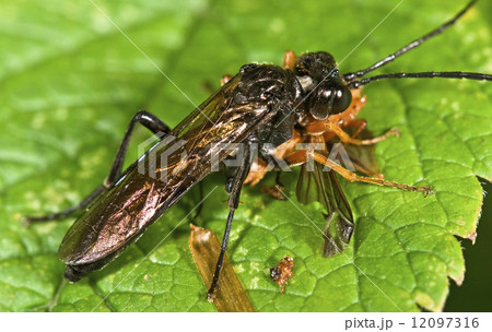 Macro photo of sawfly (order Hymenoptera, Suborder Symphyta) eating an insect (Cantharis rustica)