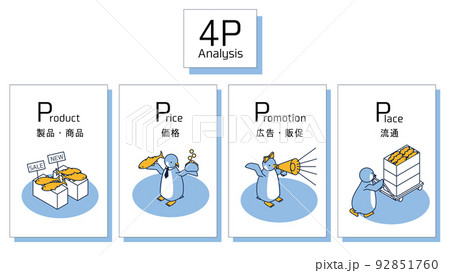 マーケティング用語の4P(製品・商品、価格、広告・販促、流通)を表すペンギン