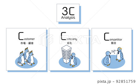 マーケティング用語の3C(市場・顧客、競合、自社)を表すペンギン