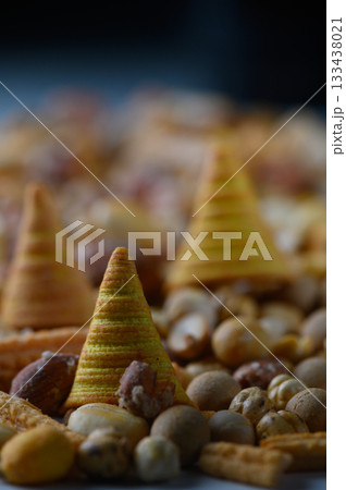 Deliciously crafted conical snacks surrounded by a medley of nuts and treats on a rustic surface